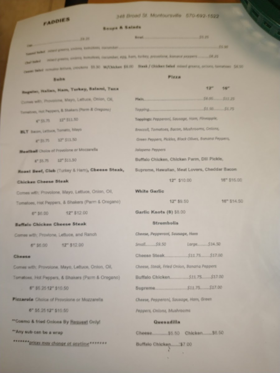 Faddies Ice Cream & Pizza offers a delightful and diverse menu that caters to a variety of tastes, from savory pizzas to fresh salads. A standout favorite is the Pepperoni Pizza, which features a generous amount of zesty pepperoni on a perfectly baked crust. For those seeking a more unique flavor, the Ham Meat Ball pizza delivers a savory combination of ham and tender meatballs. The White Garlic pizza is a perfect choice for garlic lovers, offering a rich and aromatic experience. If you're in the mood for something lighter, the Chef Salad provides a fresh and satisfying option, with a well-balanced mix of vegetables. Whether you're indulging in pizza or looking for something more refreshing, Faddies Ice Cream & Pizza has a menu that is sure to please.